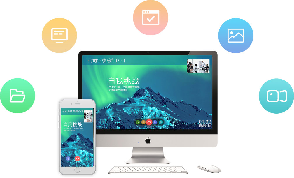 远程画面共享。共享桌面、共享文件、共享应用窗口、推送图片视频,所有参会人均可看到共享的内容,加强了参会人的远程沟通的便利度,降低远程沟通的成本